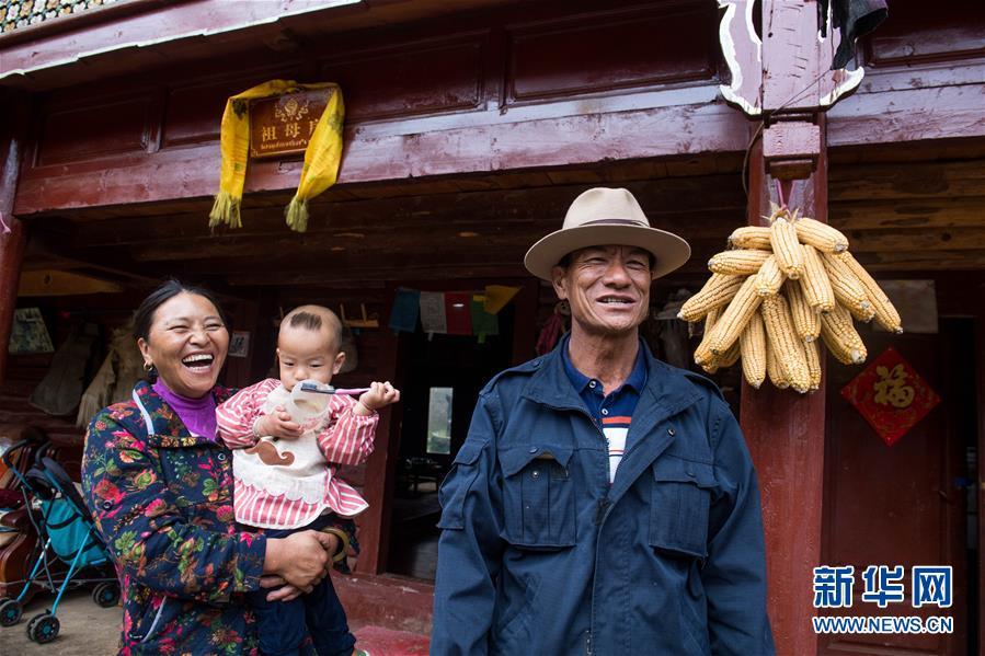 寧蒗永寧鄉(xiāng)泥鰍溝村委會(huì)八珠村民小組的摩梭人阿普私根(右)站在自家門口(7月30日攝)。他家是摩梭母系家庭重點(diǎn)保護(hù)民居,依靠旅游服務(wù)等家庭年收入近20萬元。新華社記者 胡超 攝