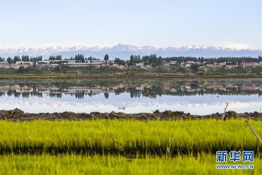 在新疆察布查爾錫伯自治縣種羊場(chǎng)托海依村拍攝的一處農(nóng)田,秧苗與遠(yuǎn)處的雪山相映成趣(5月21日攝)。近日,隨著氣溫漸高,地處新疆伊犁河谷的察布查爾錫伯自治縣迎來(lái)插秧高峰期,田間地頭一派繁忙景象。塊塊稻田水滿如鏡,田間防護(hù)林枝繁葉茂,遠(yuǎn)處雪山依稀可見(jiàn),如一幅在大地上鋪展開的生態(tài)畫卷。新華社記者胡虎虎 攝