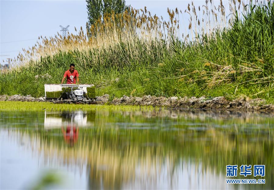 新疆察布查爾錫伯自治縣種羊場托海依村村民在農(nóng)田里插秧(5月21日攝)。近日,隨著氣溫漸高,地處新疆伊犁河谷的察布查爾錫伯自治縣迎來插秧高峰期,田間地頭一派繁忙景象。塊塊稻田水滿如鏡,田間防護林枝繁葉茂,遠處雪山依稀可見,如一幅在大地上鋪展開的生態(tài)畫卷。新華社記者胡虎虎 攝