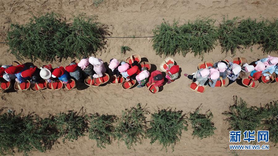 紅寺堡生態(tài)移民區(qū)的移民在百瑞源枸杞種植基地采摘頭茬枸杞(5月30日無人機(jī)拍攝)。近日,在寧夏吳忠市紅寺堡區(qū)百瑞源枸杞種植基地,頭茬枸杞迎來采摘收獲季。今年頭茬枸杞采摘期比往年提前20天左右。據(jù)了解,該基地地處紅寺堡生態(tài)移民區(qū),占地3000畝,采摘季節(jié)每天有數(shù)百名當(dāng)?shù)匾泼裨谔镩g采摘勞作。新華社記者王鵬 攝