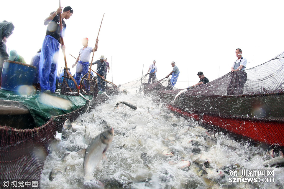 ???? 2018年6月26日,江蘇省常州市嘉澤鎮(zhèn)捕撈村的漁民組織夏季捕撈,一網(wǎng)魚(yú)達(dá)五萬(wàn)余斤,以鰱魚(yú)為主,供應(yīng)市場(chǎng)需求。夏捕的魚(yú)價(jià)較平時(shí)有所上漲,漁民粗略估計(jì)可增收上萬(wàn)余元。