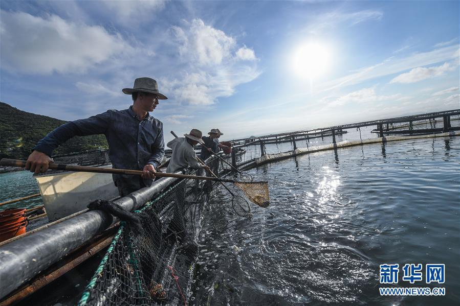 8月18日,南麂島海域內(nèi)的“海上牧場(chǎng)”養(yǎng)殖區(qū)內(nèi),漁民正捕撈大黃魚(yú),處于仿生養(yǎng)殖環(huán)境的大黃魚(yú)需要生長(zhǎng)2至3年。進(jìn)入8月,浙江省溫州市平陽(yáng)縣南麂鎮(zhèn)海域上大片的大黃魚(yú)、貽貝等特色海產(chǎn)品養(yǎng)殖區(qū)域迎來(lái)豐收季節(jié),養(yǎng)殖戶們駕駛漁船在養(yǎng)殖區(qū)海域進(jìn)行打撈收獲,在碧海藍(lán)天下構(gòu)成了一幅“海上牧場(chǎng)”的美麗豐收景象。近年來(lái),南麂鎮(zhèn)政府引導(dǎo)漁民養(yǎng)殖戶充分發(fā)揮“靠海吃?!钡馁Y源優(yōu)勢(shì),大力發(fā)展海洋養(yǎng)殖經(jīng)濟(jì)和海島旅游經(jīng)濟(jì),實(shí)現(xiàn)了南麂由“生態(tài)美”向“產(chǎn)業(yè)美”,“產(chǎn)業(yè)美”向“經(jīng)濟(jì)美”的轉(zhuǎn)變。同時(shí)該鎮(zhèn)堅(jiān)持以大黃魚(yú)、貽貝等為特色產(chǎn)業(yè)支撐,精準(zhǔn)發(fā)展高效海洋養(yǎng)殖業(yè),重點(diǎn)培養(yǎng)一批新型職業(yè)漁民,依靠專業(yè)技術(shù)支持,實(shí)現(xiàn)深海仿生養(yǎng)殖,讓好生態(tài)造就好品質(zhì),重點(diǎn)打造南麂養(yǎng)殖品牌,組建營(yíng)銷(xiāo)網(wǎng)絡(luò),拓展特色海產(chǎn)品市場(chǎng)。新華社記者 徐昱攝