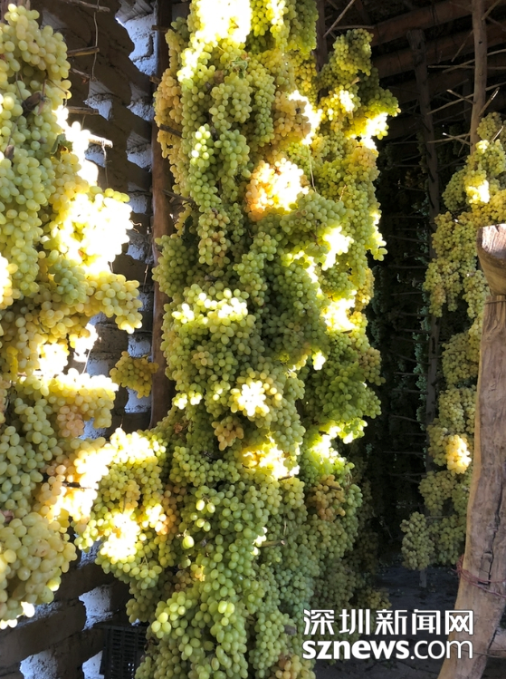 鏤空的土磚房具有良好的通透性,把葡萄搭在干樹枝上一層層碼起來高達(dá)屋頂,慢慢就會失去水分自然晾成葡萄干了。趙春麗攝