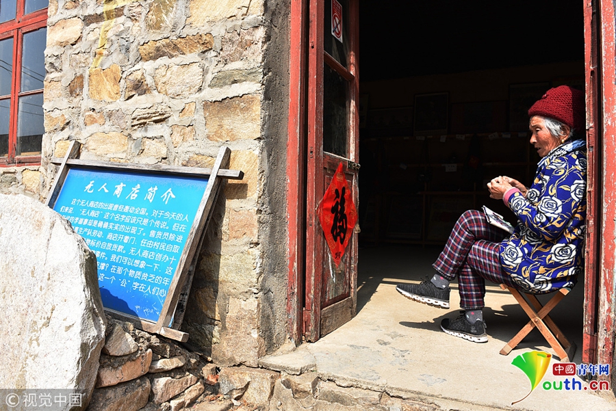 2018年3月11日,在山東省日照市五蓮縣街頭鎮(zhèn)大山深處的李崮寨村,負責(zé)管理“無人商店”的老人惠玉秀坐在商店門口納鞋墊。
