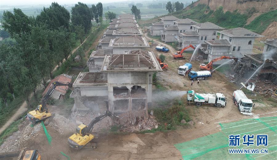 8月14日,大型機械對西安市鄠邑區(qū)蔣村鎮(zhèn)的違建別墅進行拆除(無人機拍攝)。新華社記者 邵瑞 攝