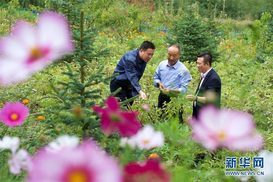 在寧夏固原市西吉縣吉強鎮(zhèn)龍王壩村,固原市農(nóng)業(yè)學(xué)校林業(yè)高級講師鄧志力(中)在指導(dǎo)村民進行油用牡丹種植(8月30日攝)。