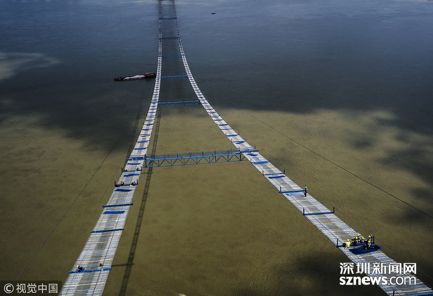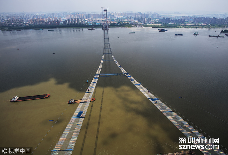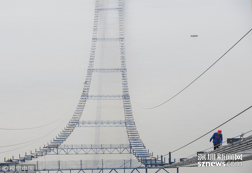2018年5月14日,武漢,武漢楊泗港長江大橋上空,上部結(jié)構(gòu)施工進入貓道面網(wǎng)鋪設(shè)階段,數(shù)十名中鐵大橋局工人在跨江高空拼搏趕超,江面上空的臨時“吊橋”悄然形成。數(shù)十名工人在長江上空228米處拼搏趕超,臨時“天梯”悄然形成。