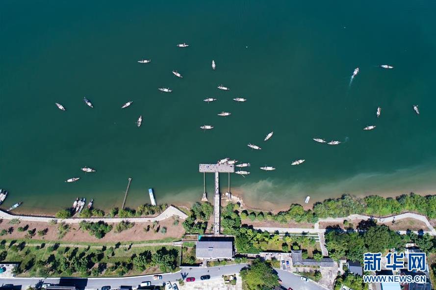 9月18日,漁船陸續(xù)從碼頭出發(fā),行駛到富春江里捕撈江鮮(無人機拍攝)。