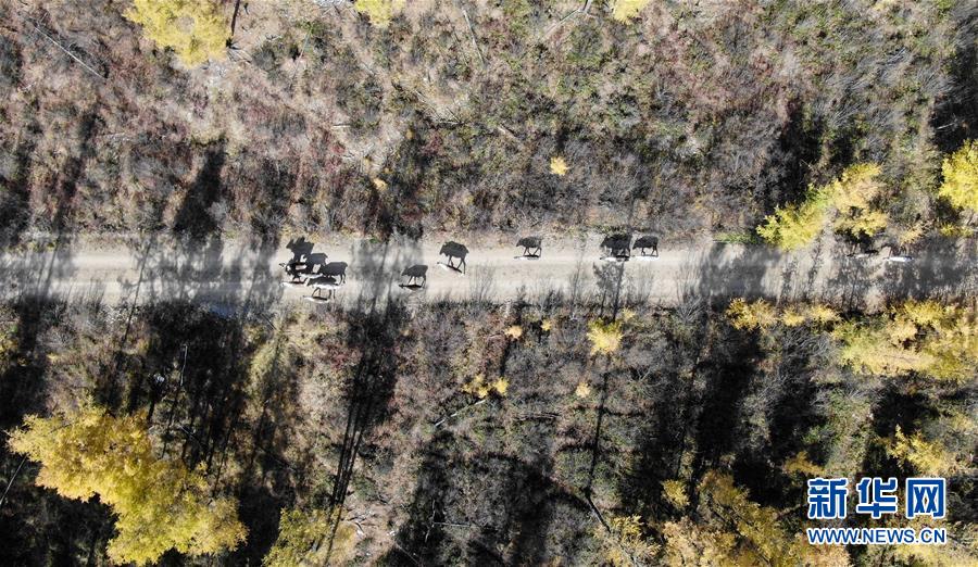 內(nèi)蒙古大興安嶺根河林業(yè)局約安里林場(chǎng)里的馴鹿(9月18日無人機(jī)拍攝)。新華社記者李任滋攝