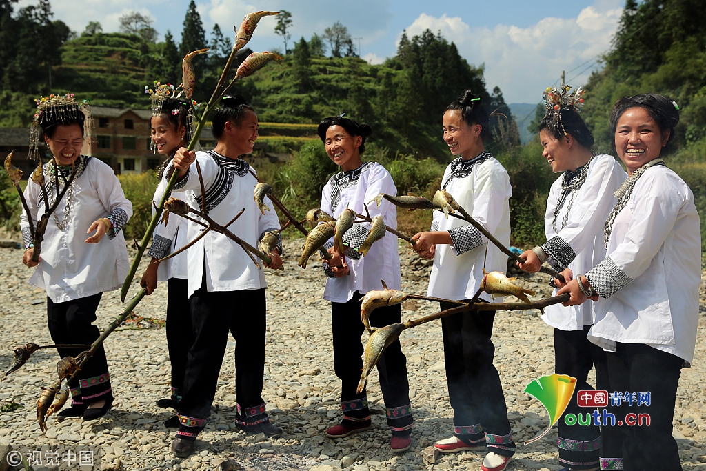 2016年9月17日,貴州省榕江縣平陽(yáng)鄉(xiāng)硐里村七位侗家婦女們正燒魚。每年中秋時(shí)節(jié),當(dāng)?shù)囟弊逋_田放水,捉魚,全寨男女老少,野外生起篝火烤魚,用烤魚、米酒等,祭祀魚神,祈禱魚糧豐收的傳統(tǒng)民俗活動(dòng)。