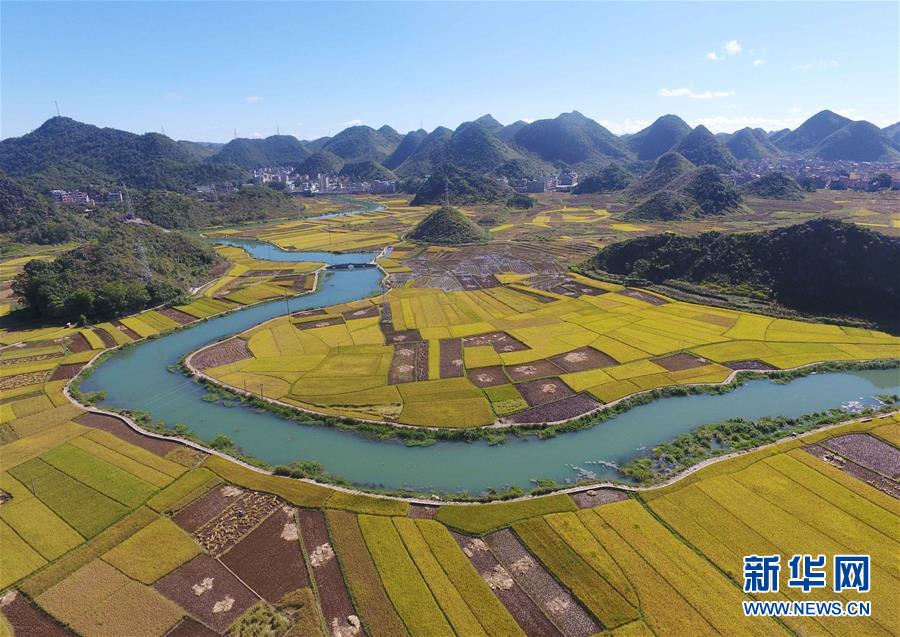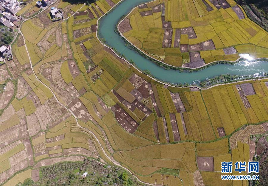 這是廣南縣八寶鎮(zhèn)壩龍村的田園景色(9月20日無人機拍攝)。 云南省文山壯族苗族自治州廣南縣八寶鎮(zhèn)今年種植優(yōu)質水稻22000余畝,秋收季節(jié),田野里一片金黃,景色如畫。 新華社記者楊宗友攝