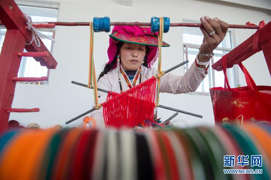 員工卓瑪在鹽湖鄉(xiāng)羌麥村民族手工編織廠工作(9月19日攝)。 2018年,西藏阿里地區(qū)革吉縣鹽湖鄉(xiāng)政府自籌資金成立羌麥村民族手工編織廠,編織廠將當?shù)貍鹘y(tǒng)手工編織技藝與市場需求相結(jié)合,生產(chǎn)手提包、圍脖、腰帶、毛毯、藏式頭巾等產(chǎn)品,并參加旅游推介活動,拓寬編織品銷售渠道,助力當?shù)鼐用衩撠殹?新華社記者 劉東君 攝