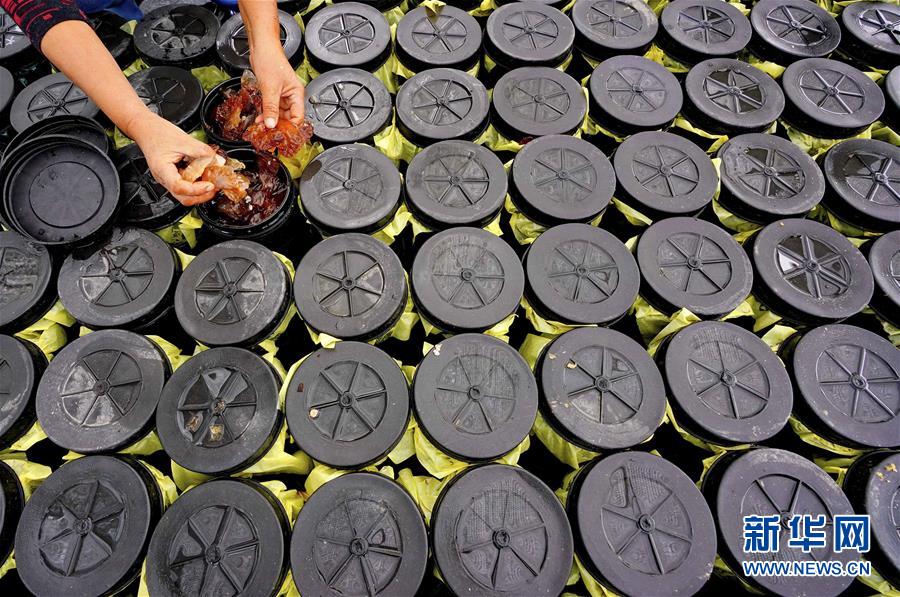 9月21日,灤南縣南堡鎮(zhèn)南堡二村一家海蜇養(yǎng)殖場(chǎng)的工人在展示鹵制好的海蜇頭。新華社記者楊世堯攝
