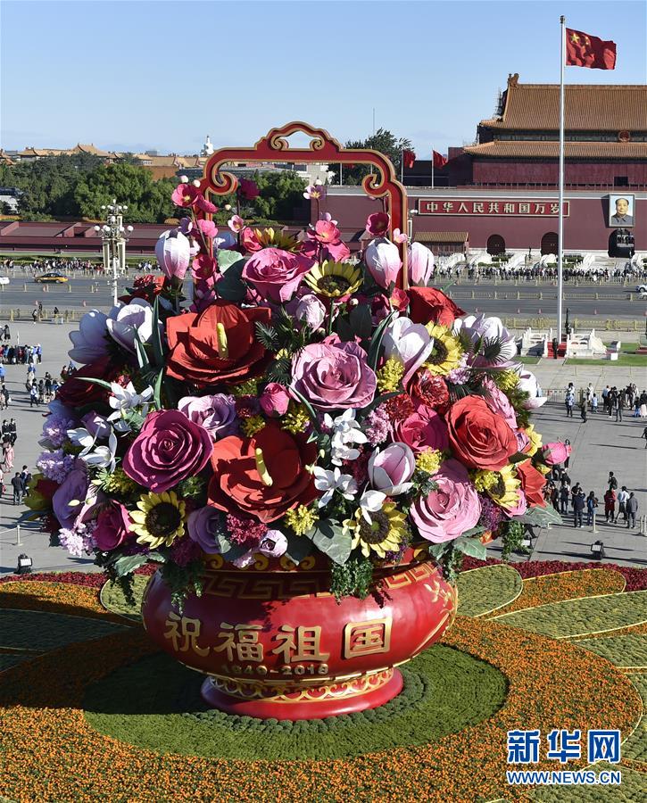 當(dāng)日,“祝福祖國”巨型花籃在北京天安門廣場全面亮相。據(jù)了解,從2011年開始,“祝福祖國”巨型花籃一直作為天安門廣場中心花壇的主景在國慶節(jié)期間向祖國獻(xiàn)禮。今年花籃內(nèi)布置有紅掌、梅花、康乃馨、向日葵、蘭花、月季等多種仿真花卉,寓意幸福吉祥。 新華社記者 李賀 攝