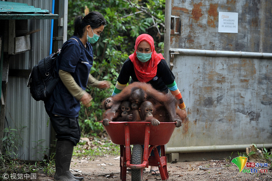 印尼加里曼丹克塔邦,國際動物救援(IAR)猩猩安全與保護(hù)中心里,飼養(yǎng)員用獨(dú)輪車把猩猩寶寶送到森林學(xué)校。圖片作者:Newscom