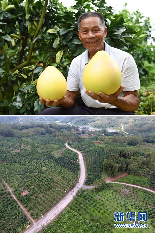 這張拼版照片顯示的是:上圖,9月18日,廣西武宣縣東鄉(xiāng)鎮(zhèn)風(fēng)沿村村民陳紹桂展示剛采摘的蜜柚;下圖,9月18日,人們在風(fēng)沿村三紅蜜柚種植基地內(nèi)行走(無人機(jī)拍攝)。 新華社記者陸波岸攝