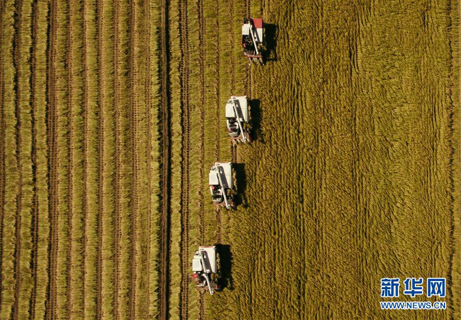 在吉林省吉林市萬昌鎮(zhèn),農(nóng)民在張楠楠成立的家庭農(nóng)場的稻田間駕駛收割機(jī)收割水稻(9月18日攝)。 新華社記者 許暢 攝