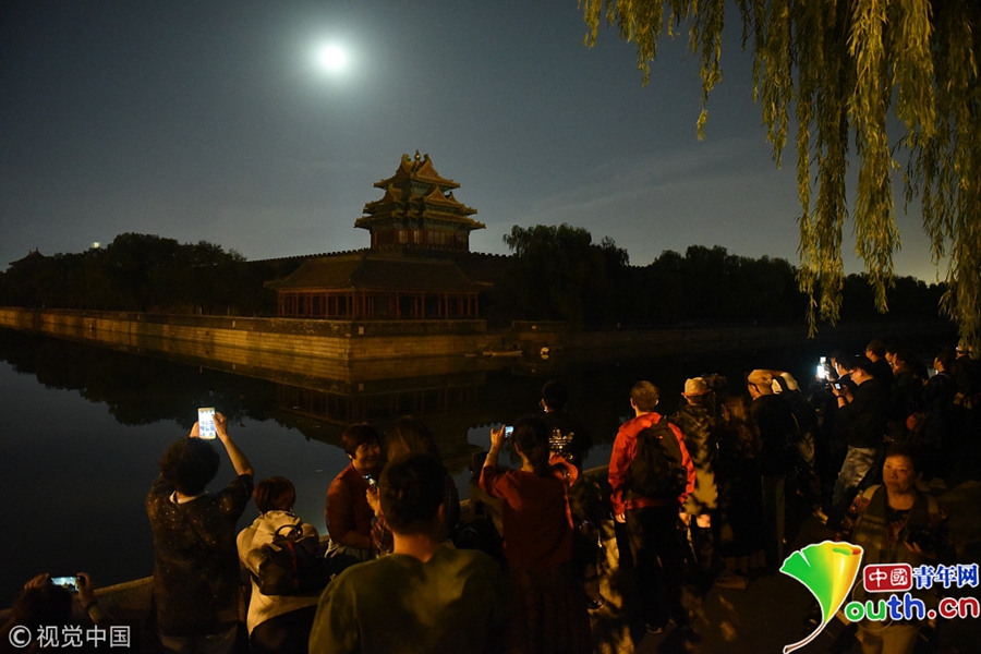 中國(guó)青年網(wǎng)北京9月25電 2018年9月24日,中秋節(jié),北京故宮西北角樓,許多市民和攝影愛(ài)好者聚集故宮角樓下拍攝月亮。圖片作者/視覺(jué)中國(guó)