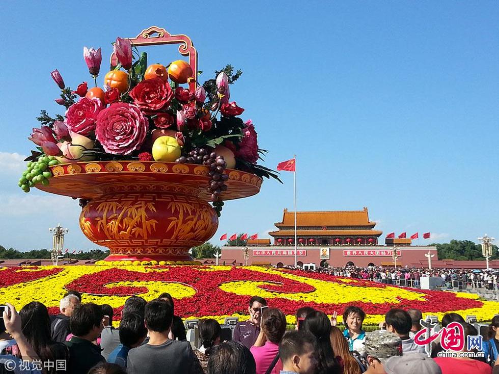 2013年天安門廣場首次以花果籃的形式布置國慶主花壇,國慶花籃名為“祝福祖國”,高達(dá)18.2米,籃盤直徑達(dá)到15米,中心花壇直徑達(dá)到50米,是天安門廣場歷年最大的花籃。本次的花果籃使用牡丹、玉蘭、松枝、竹子四個(gè)品種的大型仿真花,并創(chuàng)新融合石榴、蘋果、蟠桃、葡萄等水果造型,表達(dá)了富貴吉祥、平安幸福、節(jié)節(jié)高升等良好寓意。除了仿真的花果,施工方還在花果籃中穿插擺放大規(guī)格三角梅、一品紅等盆栽花卉。據(jù)了解,本次花果籃內(nèi)的三角梅是首次進(jìn)入天安門國慶花壇主景。此外,“籃子”采用玻璃鋼材料,可以重復(fù)利用。 據(jù)了解,如此巨大的花果籃可抵抗10級大風(fēng)。