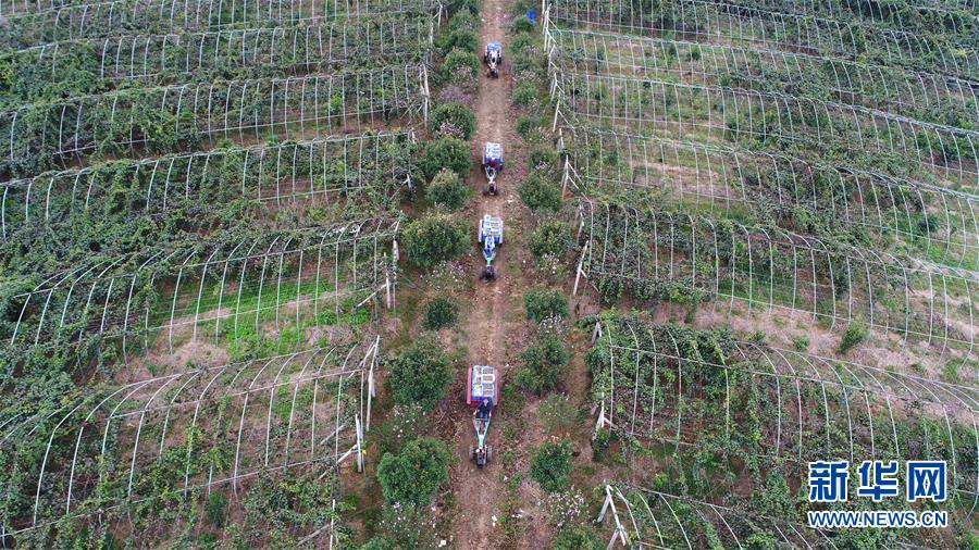 9月25日,在肥西縣銘傳鄉(xiāng)劉老圩獼猴桃種植基地,農(nóng)民運送剛采摘的獼猴桃(無人機拍攝)。