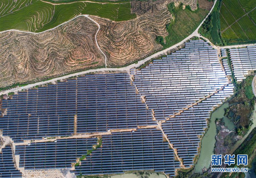 空中俯瞰湖州市埭溪鎮(zhèn)東紅村的光伏發(fā)電站(9月26日無(wú)人機(jī)拍攝)。該光伏電站占地2500多畝,是當(dāng)?shù)貜U棄礦坑通過(guò)改造建成的“農(nóng)光互補(bǔ)”光伏發(fā)電站。