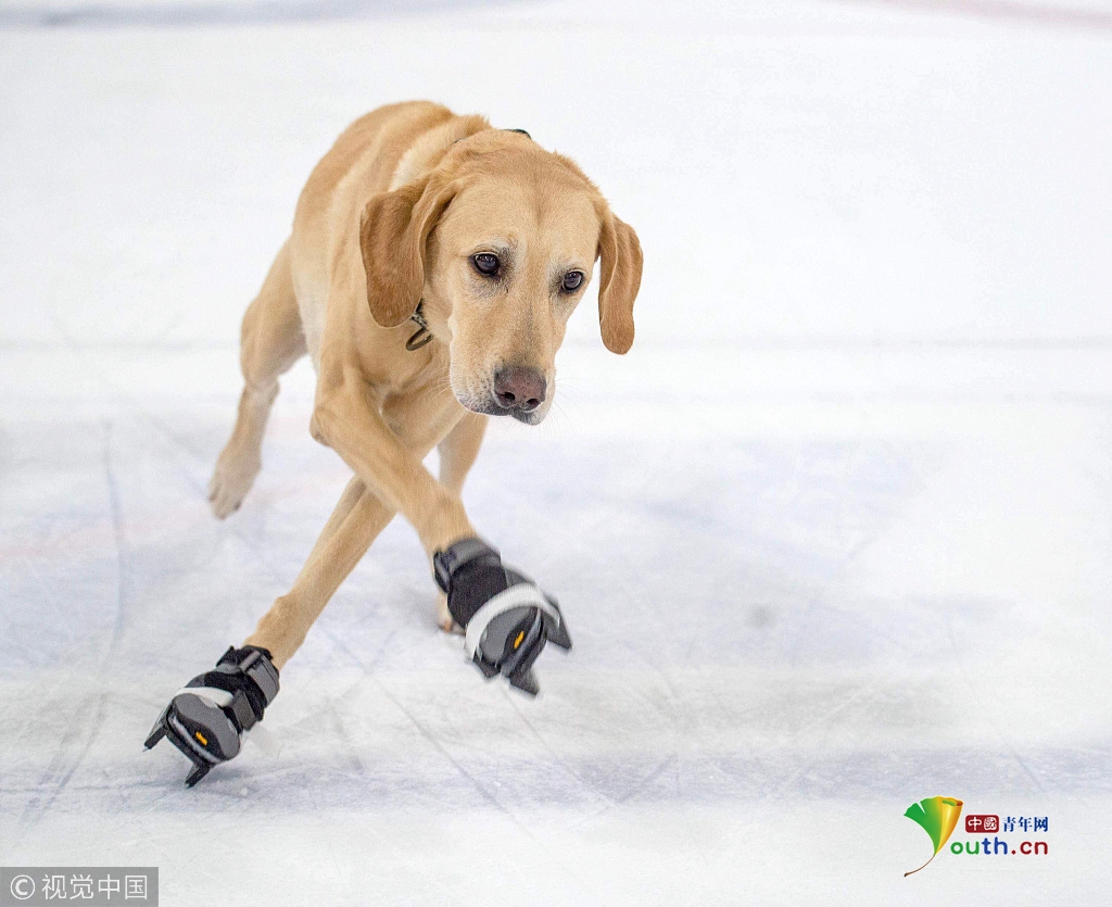 2018年9月26日訊。(具體拍攝時間不詳)這只可愛的拉布拉多犬本尼是世界上第一只會滑冰的狗。