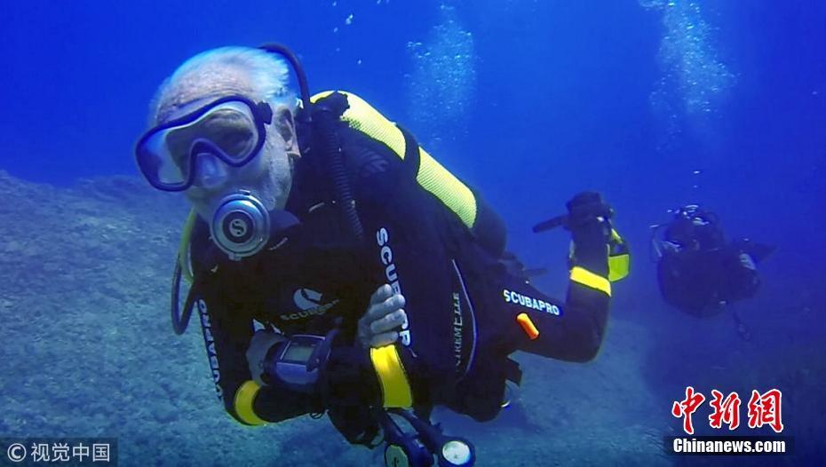 當(dāng)?shù)貢r(shí)間2018年9月1日,塞浦路斯,95歲的英國(guó)潛水員雷·伍利(Ray Woolley)以44分鐘下潛40.5米的成績(jī)打破了自己94歲達(dá)成的記錄(41分鐘下潛38.1米),二度刷新了世界上年齡最大的男性潛水員最好成績(jī)。在此次下潛中,這位二戰(zhàn)退伍老兵對(duì)距塞浦路斯南部城鎮(zhèn)拉納卡約2公里處的海域進(jìn)行了探索,1980年一艘名為“芝諾比亞號(hào)”(Zenobia)的貨船在這里進(jìn)行首次航行時(shí)沉沒。圖片來源:視覺中國(guó)