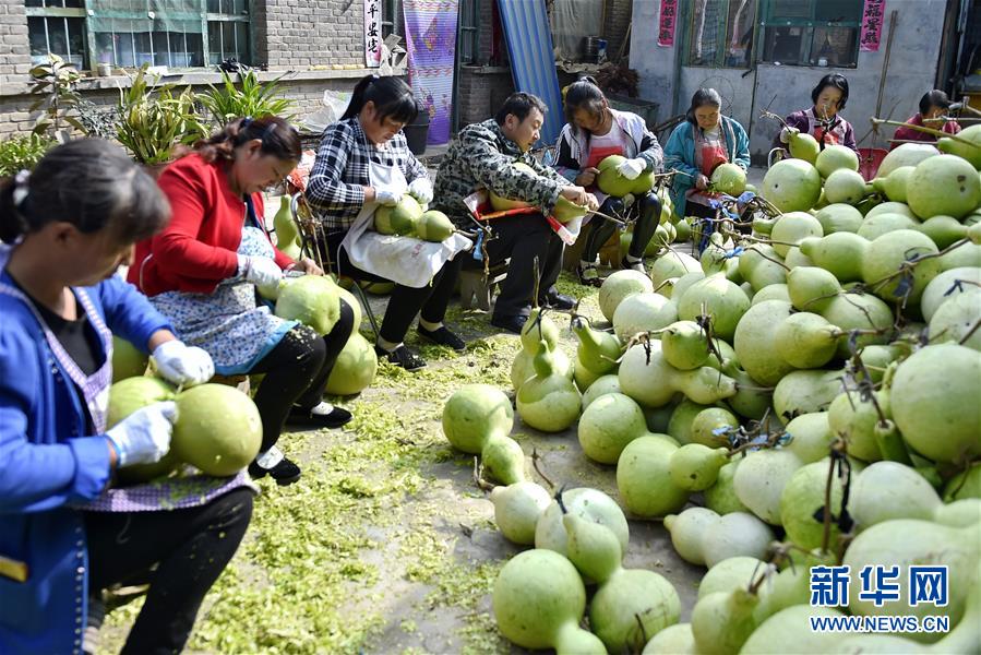9月27日,山西省安澤縣和川鎮(zhèn)孔旺村的村民將葫蘆去皮。近日,山西省安澤縣和川鎮(zhèn)孔旺村種植的葫蘆喜獲豐收,村民們忙著將摘下的葫蘆去皮晾干。孔旺村于2016年成立葫蘆種植合作社,種植、采摘、加工等環(huán)節(jié)全部由貧困戶負(fù)責(zé),為貧困戶拓寬增收渠道。新華社記者 曹陽 攝