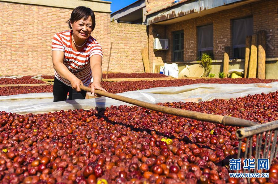 9月22日,河北省棗強縣棗強鎮(zhèn)孟家莊村的棗農(nóng)在晾曬紅棗。 近日,河北省棗強縣的2000多畝棗園迎來收獲季,棗農(nóng)們搶抓農(nóng)時,采摘、篩選、晾曬紅棗,樂享秋收的快樂。 新華社記者李曉果攝