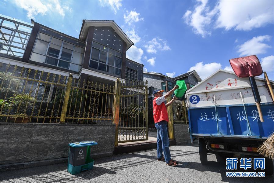 9月27日,小浦鎮(zhèn)合溪村垃圾分類清運(yùn)員符正芳在清運(yùn)村民門口的分類垃圾桶,同時(shí)他還要用手機(jī)上的垃圾分類APP進(jìn)行掃碼簽到,確保每天每戶清掃到位。從9月初開始,浙江省長(zhǎng)興縣小浦鎮(zhèn)推廣使用手機(jī)垃圾分類智能管理平臺(tái)。通過(guò)這款A(yù)PP可以進(jìn)行村民垃圾分類情況打分、清運(yùn)員每日簽到、監(jiān)督員巡查等,并能即時(shí)生成農(nóng)戶垃圾分類“成績(jī)單”,所有農(nóng)戶均可通過(guò)APP查詢垃圾分類排行榜,既方便又環(huán)保。新華社記者 徐昱 攝