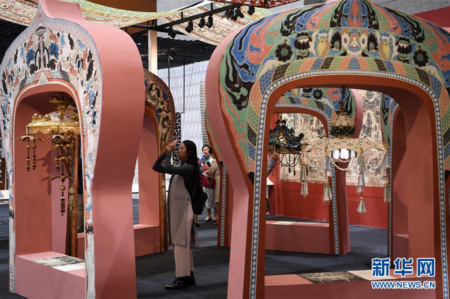 9月27日,在敦煌國際會展中心,參觀者欣賞展出的藝術(shù)品。 新華社記者范培珅攝