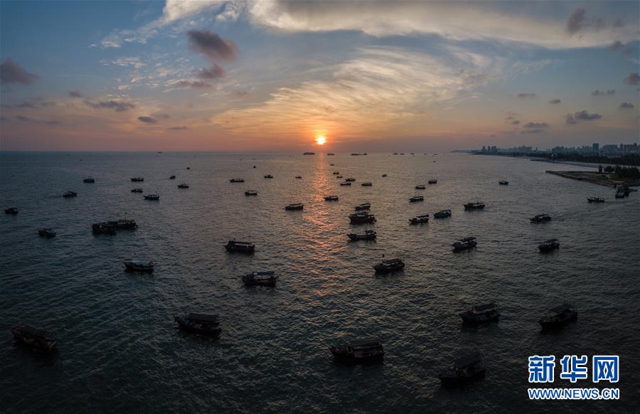 這是夕陽西下時(shí),漁船從廣西北海市銀灘風(fēng)景區(qū)出海作業(yè)(9月26日無人機(jī)拍攝,拼接照片)。 新華社記者 李鑫 攝