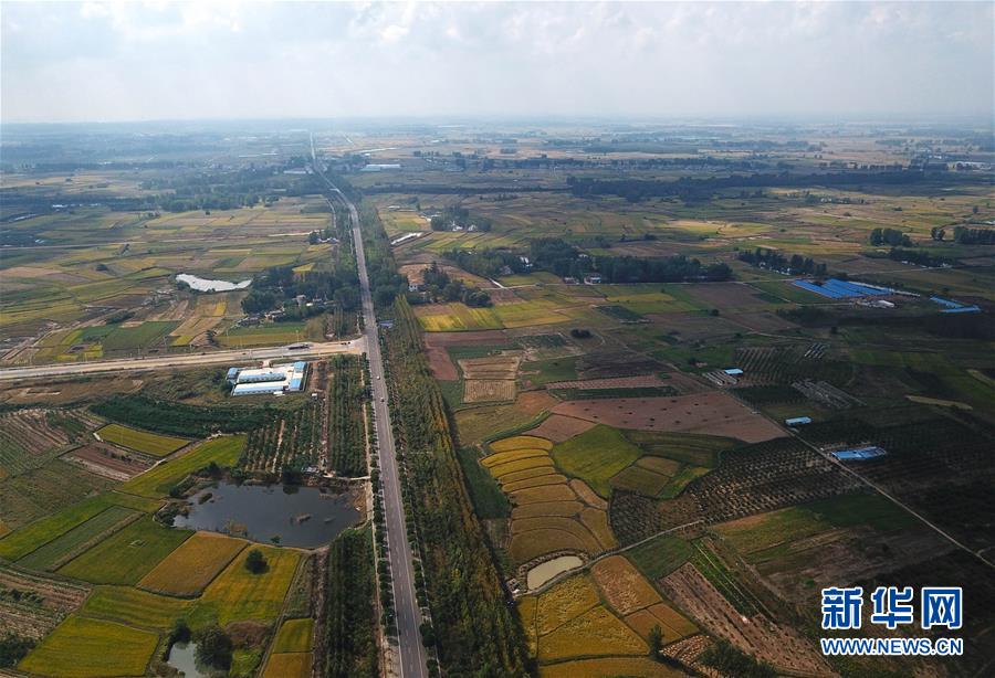 這是小崗村的稻田及公路(9月26日無人機(jī)拍攝)。