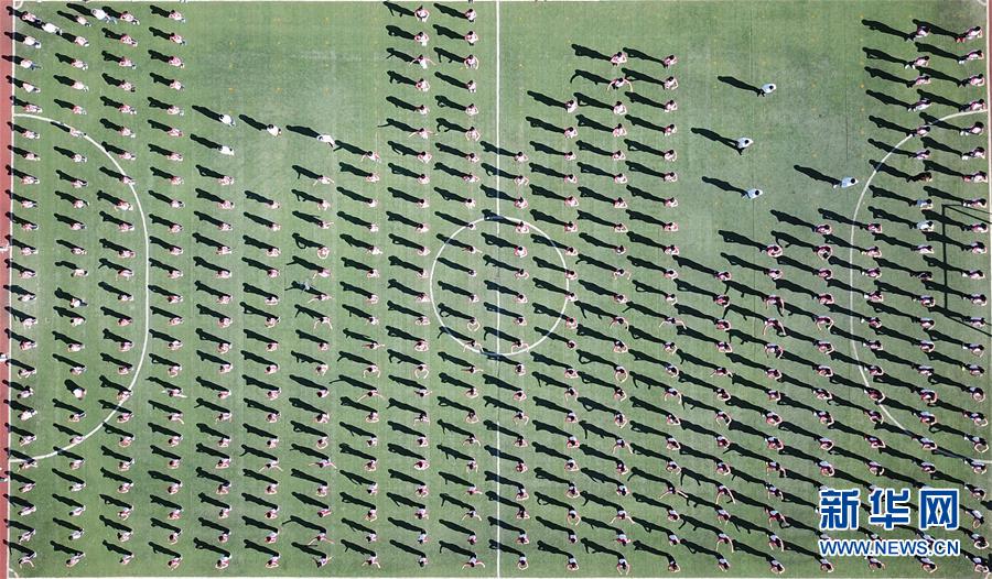 在小崗村小崗學(xué)校,學(xué)生們在體育展示課上做操(9月27日無人機(jī)拍攝)。 新華社記者 才揚(yáng)攝