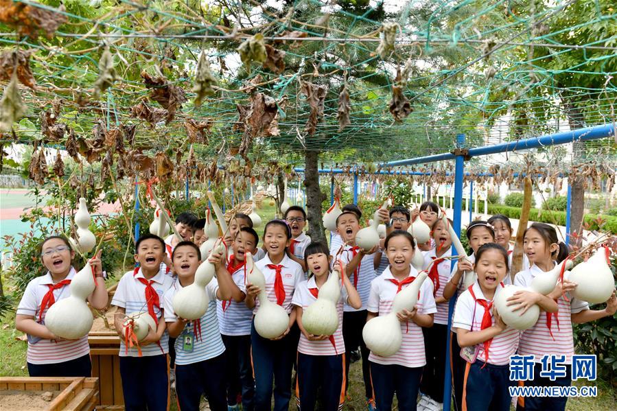 9月29日,在威海市經(jīng)濟(jì)技術(shù)開(kāi)發(fā)區(qū)新都小學(xué),學(xué)生展示采摘的葫蘆。新華社記者郭緒雷攝