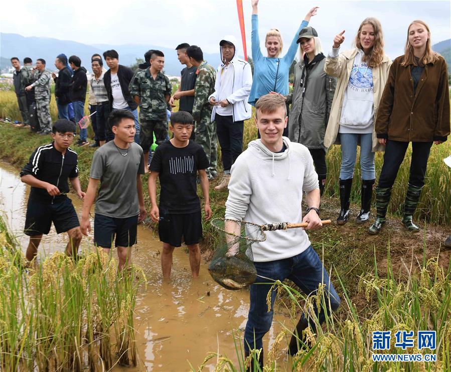 9月29日,外國游客體驗(yàn)摸魚。9月29日,云南省尋甸回族彝族自治縣2018年首屆農(nóng)民豐收節(jié)暨第二屆摸魚節(jié)在雞街鎮(zhèn)舉行,當(dāng)?shù)剞r(nóng)民和游客在豐收的稻田里進(jìn)行摸魚、拔谷穗、山歌對(duì)唱等活動(dòng),享受收獲的喜悅。新華社記者楊宗友攝