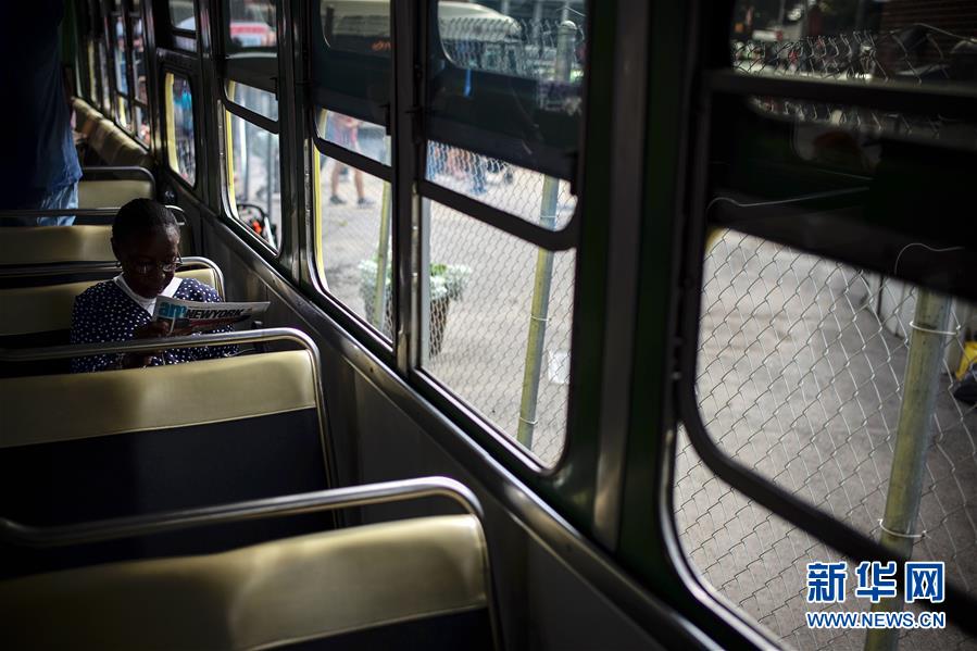 10月7日,在美國紐約舉行的巴士節(jié)上,一名女子在3100號(hào)巴士上看報(bào)。該車型是美國首批配備空調(diào)的巴士車型之一。 新華社記者李木子攝