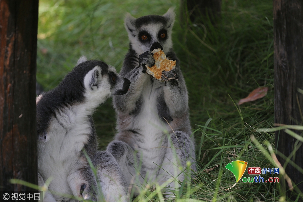 2017年10月4日,重慶永川樂(lè)和樂(lè)都的動(dòng)物飼養(yǎng)員給環(huán)尾狐猴喂食月餅。