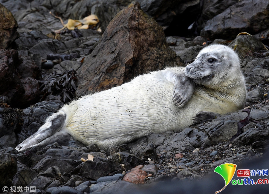 中國(guó)青年網(wǎng)北京10月9日電 當(dāng)?shù)貢r(shí)間2018年10月8日,英國(guó)彭布羅克郡,一只大西洋海豹幼崽躺在海邊礁石上。海豹幼崽出生時(shí)都有毛茸茸的白色非防水皮毛,它們會(huì)在第四周蛻皮。