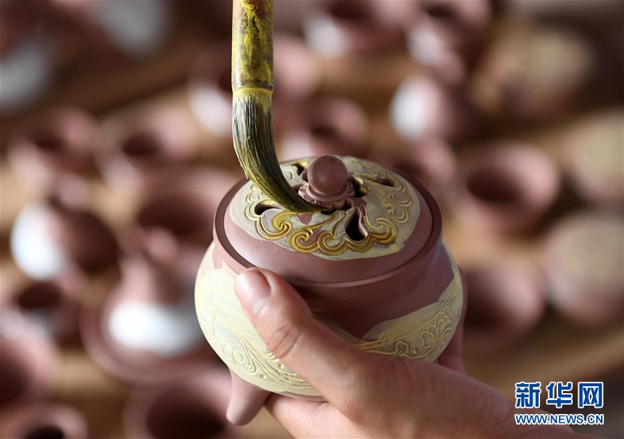 10月9日,欽州市一家廣西坭興陶生產(chǎn)企業(yè)的員工在制作坭興陶產(chǎn)品。 新華社記者 陸波岸 攝