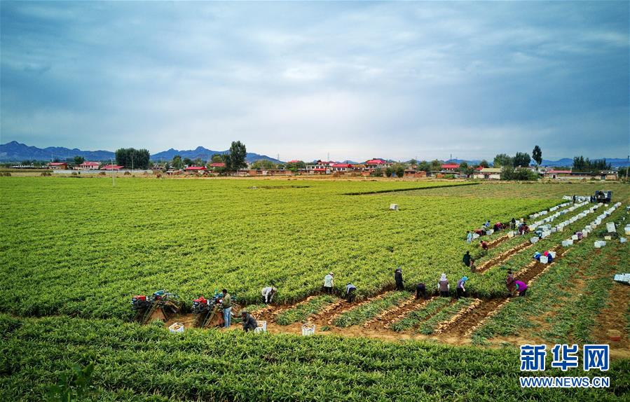 10月9日,秦皇島市撫寧區(qū)留守營鎮(zhèn)桑園村農民在收獲生姜(無人機拍攝)。 近年來,河北省秦皇島市撫寧區(qū)在農業(yè)結構調整過程中,引導當?shù)剞r民種植優(yōu)質無公害生姜,并安排農業(yè)技術員定期到田間指導農民對生姜進行標準化管理。據(jù)介紹,今年該縣生姜種植面積1萬多畝,預計產生姜5萬噸,種植戶每畝純收入達1萬多元。 新華社記者 楊世堯 攝