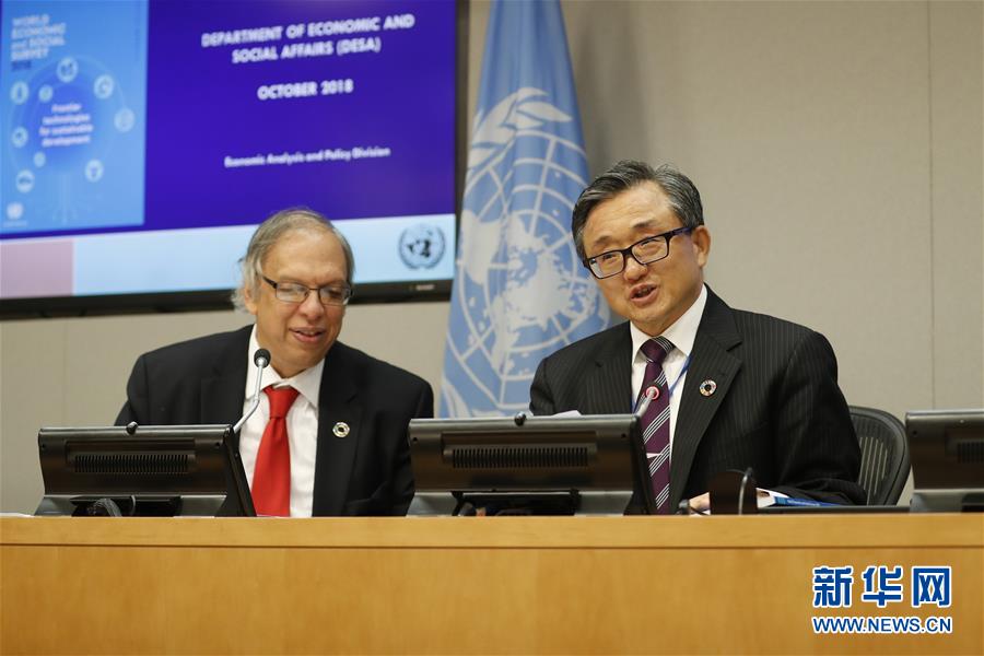 10月8日,在位于紐約的聯(lián)合國(guó)總部,聯(lián)合國(guó)負(fù)責(zé)經(jīng)濟(jì)和社會(huì)事務(wù)的副秘書長(zhǎng)劉振民(左)向記者介紹《2018年世界經(jīng)濟(jì)和社會(huì)概覽》。新華社記者李木子攝