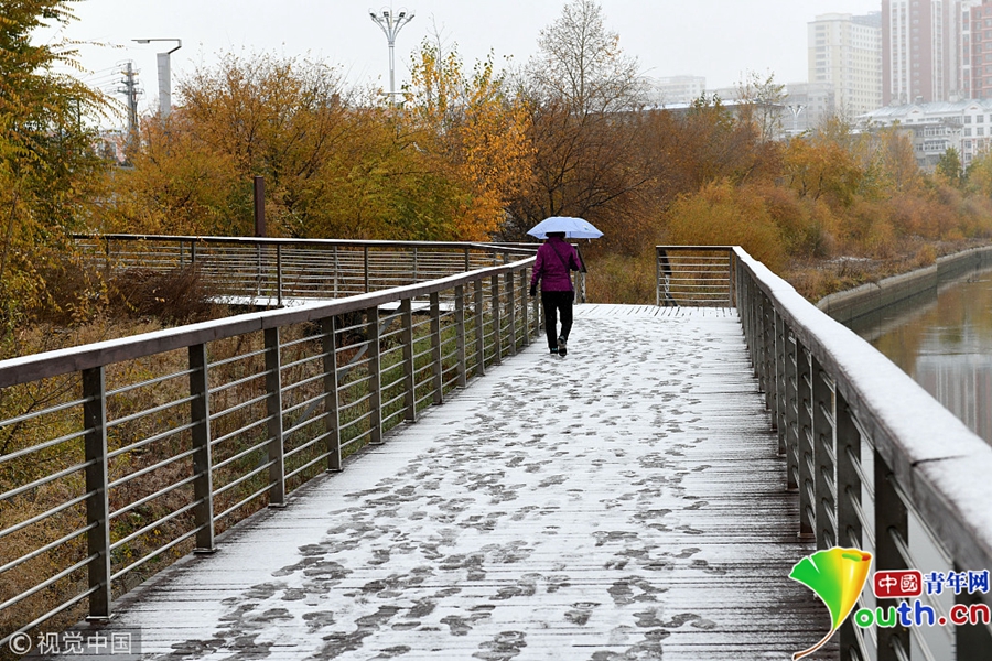 市民打傘行走在雪地里。