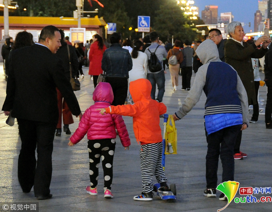 北京冷空氣來襲 游客紛紛著秋冬裝游覽天安門