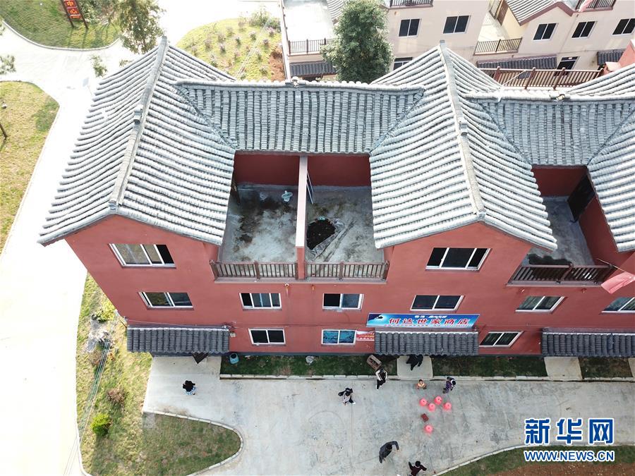 白褲瑤族同胞在廣西南丹縣里湖瑤族鄉(xiāng)移民集中安置點(diǎn)的新居前(10月11日無(wú)人機(jī)航拍)。新華社記者 周華 攝