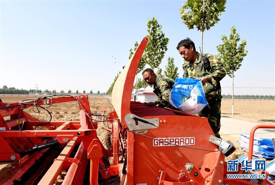 10月14日,河北省南和縣閆里鄉(xiāng)閆里村農(nóng)民將小麥種子倒入播種機(jī)。 新華社記者 朱旭東 攝
