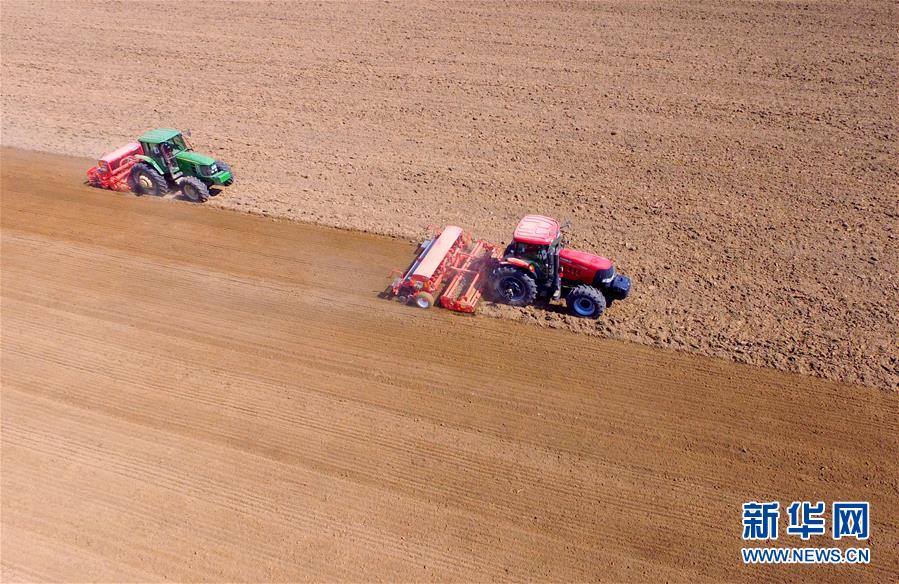 10月14日,河北省南和縣閆里鄉(xiāng)閆里村農(nóng)民在田地播種冬小麥(無(wú)人機(jī)拍攝)。新華社記者 朱旭東 攝