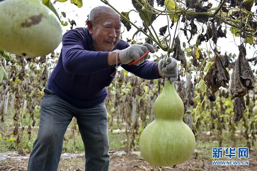 9月27日,山西省安澤縣和川鎮(zhèn)孔旺村的村民在摘葫蘆。近日,山西省安澤縣和川鎮(zhèn)孔旺村種植的葫蘆喜獲豐收,村民們忙著將摘下的葫蘆去皮晾干??淄逵?016年成立葫蘆種植合作社,種植、采摘、加工等環(huán)節(jié)全部由貧困戶負(fù)責(zé),為貧困戶拓寬增收渠道。新華社記者 曹陽(yáng) 攝