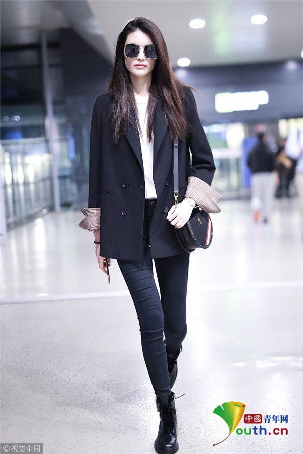 2018年10月15日,上海,何穗亮相機場。她身穿深色西裝搭配黑色緊身褲大秀超模身材,簡約造型依舊高級感十足,輕撩秀發(fā)散發(fā)女人味。