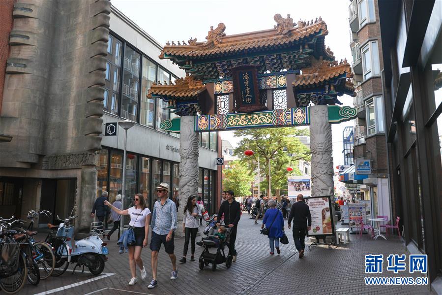 10月13日,在荷蘭海牙,人們經(jīng)過唐人街的牌坊。